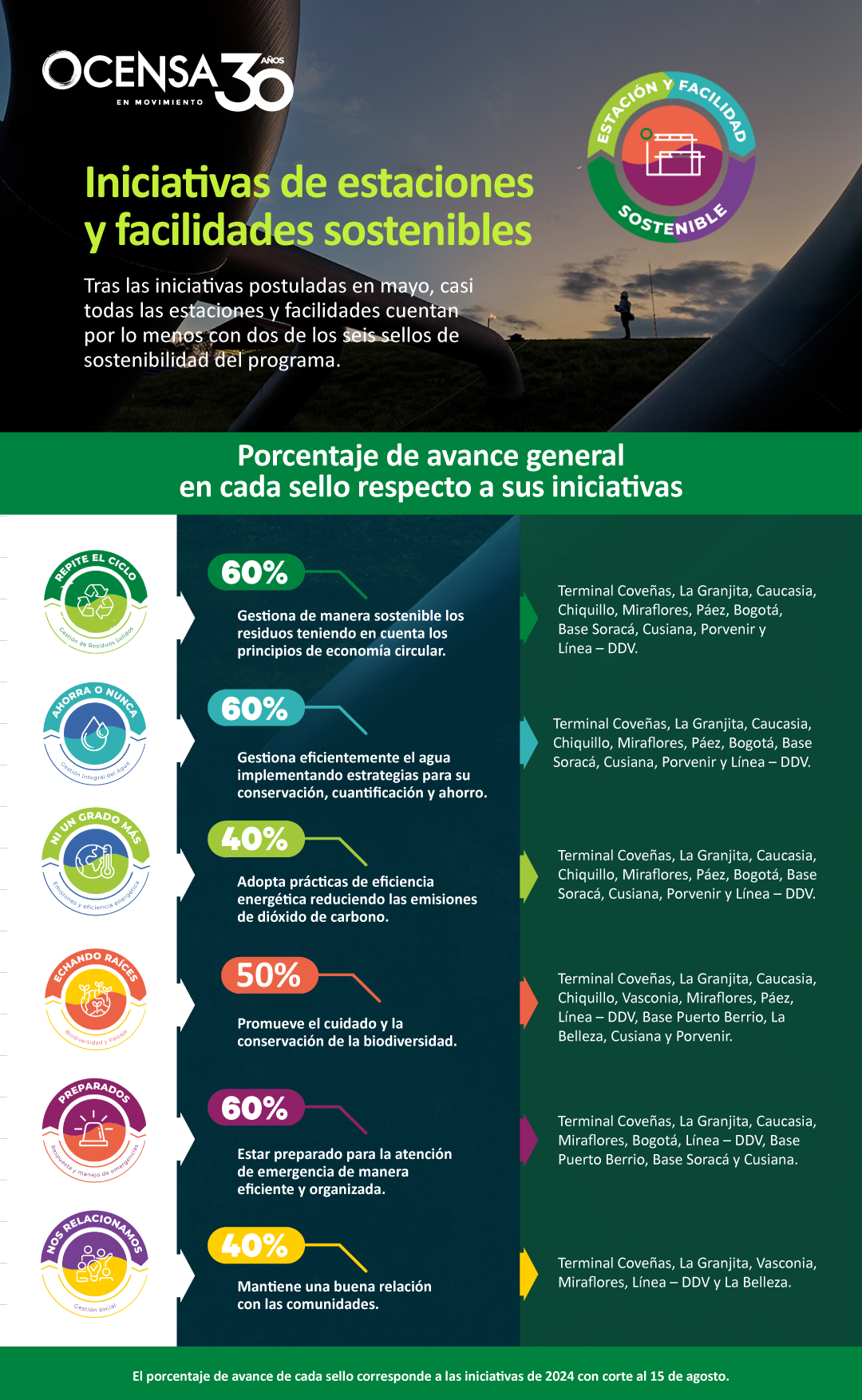 Cada facilidad continúa trabajando para proyectar iniciativas con las que puedan alcanzar la totalidad de los sellos y así lograr la insignia de estación o facilidad sostenible y de esta forma generar una transformación hacia la sostenibilidad en toda la organización.